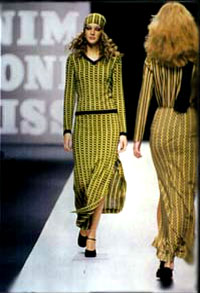 Men's suits, (the pimpier the better) are good for filling fall wardrobe voids. Best with a feminine edge (we're still girls) like vampy lipstick (either Chanel's namesake or Wet 'n' Wild #508 ). For the most in custom lip dressing, pick up a tube of solid black by Make Up Forever (# L86... Barneys, Pierre Michelle Salon) to blend with your useless, leftover reds ready for pasture. Added bonus: it doubles as smudgy black eye shadow. The gender blending scene is not even unusual anymore. Pushing further into everyday - way beyond Ru Paul's MAC gig - you know it's time to find a new trend when you're a short haired girl in a man's suit sitting next to Billy Beyond out of drag - and you're both on the same casting for something as mainstream as a West cigarettes campaign. The main vibe for fall is to mix all of it up. No, no, matchy, matchy. Mix crocheted tights and fishnets with unexpected colors, plaids, and fabric textures, and just when you think it's a bit too tacky to leave the house, you're probably on the right track. Walk tall, think and stand tall, wear longer (tall) silhouettes... long, long, long. Those platforms really help. Other fall key words are jersey & knits, leather & suedes, metallics & brights, aka lime green and orange. Lime green has stayed at the fair a bit too long, and gets tired in the make-up dept., but just about everybody looks good in some variation of orange. Style wise, things really haven't evolved much since this time last year. The big ring contender's are still Simple versus the long playing '70s Pimpadelic influence, with that "modern" area somewhere in-between. Much of the current modification of true '70s silhouettes come from the bitter facts that producing those interesting decorative top-stitching and multi pieced pattern structures is very expensive. Shapes that come from bias cut construction leave wasted chunks of fabric excess, and is not very budget efficient. Straighter A-lines are not only less expensive to produce, but lend a more modern vibe. Yet another clue unraveling the lengthy play of simplistic dressing. With more consumers fed up with the copycat system that's been giving American fashion a sour taste lately, companies that have proven to have longer staying power than Madonna are the ones to invest your bigger dollars in. The most original ideas immune to successful knock-offs seem to be coming from the Italian contingency. Watch for more Italian style invasion, as Little Italy jumps uptown to the Bendel's-Bergdorf's hood, with close to a dozen new boutiques due by next spring.
