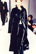 Influences were all over the place for fall, with the delightful game of "name that knockoff" being played fervently. Answers ranged from Versace '87 to as recent as Laura Whitcomb '93, which didnÍt help the quest for the common thread. Centuries old and still ticking, velvet certainly appeared over and over again, but either in shapes that would have suited a bad remake of Dangerous Liaisons or the same ol' thing. Stretch velvet T-shirts does not modernity make. Velvet at every turn, without any road signs, until thoroughly modern Girbaud came through. Shaped for real life with pajama ease, these pieces looked great and made a lot of sense (pictured as Francois explains the process to Elsa Klensch). The Girbaud team also did a little known jam-up job on an unshown velvet evening collection available via boutique in Beverly Hills and Chicago. Don't try this at home but, their velvet version has been ingeniously treated with peroxide to give it that shimmery iridescence.