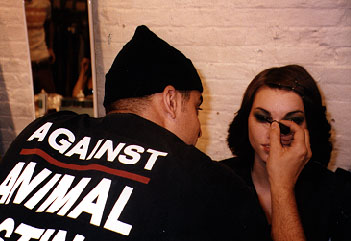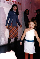 you saw With such heavy pressure to emphasize everything else but the subject at hand, it must be trying for designers to remember to make good clothes that fit. Recent faux pas include Victor Alfaro's perfectly fitting georgeous ankle length slim skirt (available at Saks on 2) that forgot a tiny back slit, or that inch of ease, so you can walk like you're not Morticia. On the other hand, the Victor Alfaro-fashioned zip-front jumpsuit rocks - in terms of fit and sex appeal. First timer show girl Rebecca Dannenberg had a busy weekend showing on Friday night andagain on Sunday's Fashion Brunch at Marion's . She pulled it together against the odds of bad club lighting, and worse timing, at Twilo. The end of the week, when everyone is too tired to see one more show, is not the best debut schedule. Nonetheless, everything was sassy cute, was made well and fit. |