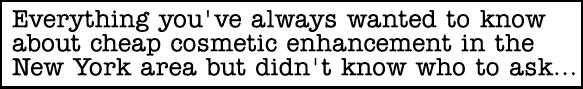 Deep within the castle-like facade of Mt. Sinai's dermatology department lives the little known clinic where the effervescent Dr. Hadi holds court every Friday - for less than half the price of surrounding cosmetically driven derm centers. Tried and trued as the best Botox bargain in town, at 275 bucks a pop, the clinic offers a variety of outpatient treatments from peels to collagen. Administered by residents with a department head hands-on and nearby, all treatments are done by pros of tomorrow. In December (This year the 14th - 15th), the department hosts their annual dermatology seminar featuring the likes of renowned Patricia Wexler (Donna Karan, supermodels, celebs) and Dr. David Goldberg where they show and tell their brand new stuff. Madison Avenue at 96th Street. Super secret direct line: 212.241.1508. On the trail of subtle, yet necessary, cosmetic enhancement - the bright flashing smile can be had at a fraction of the market cost at the NYU School of Dentistry. The "students" here are often practicing dentists from other countries like England, so they know what they're doing, they just need to cut the red tape of stateside credentials. The perk here is that the honorable man who developed porcelain laminate veneers in the first place (cover your own teeth - better than caps) Dr. Calamia, heads the department and is usually as involved with your procedure as you'd like him to be. After an initial registration investment of 85.00 which includes X-rays, you're home free to pursue your cosmetic desires. Laminates run 300 bucks a tooth (compared to 600 + everywhere but Chinatown) and can last well beyond 10 years. A new non-laser bleaching process from the UK called "boost" will set you back another 300 - takes only 15 minutes - and is a good way to whiten the rest of your teeth to meet the laminate shade you aspire towards. The only draw-back we experienced was a one time encounter with a student reeking of a recent weed-smoking break. (Hey, it happens.) We politely declined his assignment to us, and our replacement student was highly competent and drug-free. NYU Dental School Clinic, 1st Avenue @24th Street. |