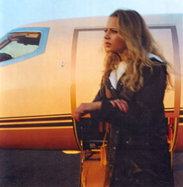 Brown hooded snap front coat: Andre CourregesWhite wool dress: Donald BrooksWine suede calf-high boots: Gucci Destination: Unknown